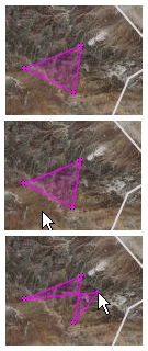 In the second picture, the cursor points to a location not in the polygon. If you click the cursor in this place, the three-sided figure will be replaced by a four-sided figure, with its fourth vertex at the location of the mouse click.